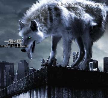 本教程学习如何用Potoshop合成一个雨夜站在房顶,嘴里流着口水准备扑向猎物的金刚灰太狼,主要用到了笔刷、蒙版、调整层、图层样式和素材的叠加。