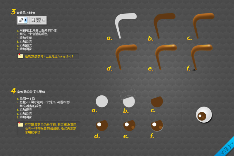 本教程主要使用PS绘制正在勤劳工作的卡通小蜜蜂,主要通过钢笔工具绘制基本的形状,然后在通过图层样式来表现质感和上色,希望ps家园的朋友通过教程可以掌握更多的PS工具使用技