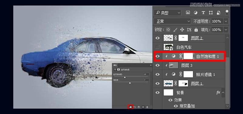 15、将原来白色汽车的图层移至背景层前,添加蒙版用画笔擦除,保留影子部分。(如缝合不好应对图层进行栅格化,进入自由变换调整)。