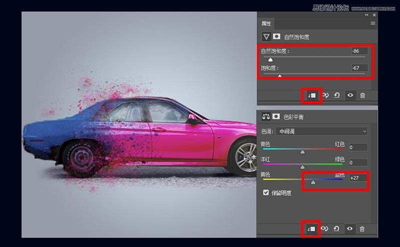16、用自然饱和度和色彩平衡调节影子色调,让它拥有一点环境色。