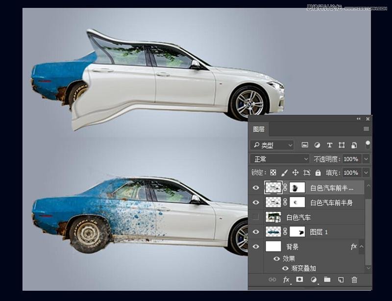 6、导入素材2白色汽车的这张图片,将车辆前半身抠出来,缝合好位置。白色汽车图层可暂时隐藏,在蓝色汽车的图层上建个蒙版用黑色画笔将车头露出来的部分擦除。