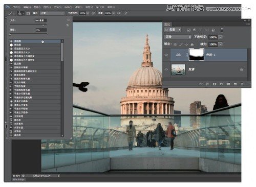 为了避免前景中天桥的亮度也受到影响,我们需要用画笔工具对蒙版进行编辑。从选项栏上的画笔预设选择器中选择一款大尺寸柔边画笔,将前景色设置为黑色。单击“色阶 1”图层右侧的蒙版缩略图,在玻璃围栏上涂抹还原对应部分的影调。