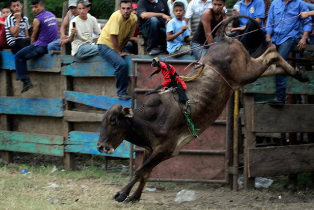 1. 在尼加拉瓜首都马纳爪的斗牛节中,一只猴子骑着一头牛出场。